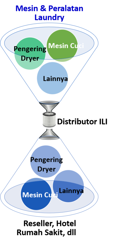 Distributor ILI, terutama terkait dengan mesin laundry adalah entitas organisasi yang pada prinsipnya menyaring dan menyalurkan solusi barang dan jasa laundry kepada entitas organisasi bisnis lain, dengan skala relative besar seperti reseller, hotel, rumah sakit atau lainnya, guna pengamanan kepentingan, kenyamanan dan kesuksesan bersama secara utuh dan berkelanjutan bagi para anggotanya.